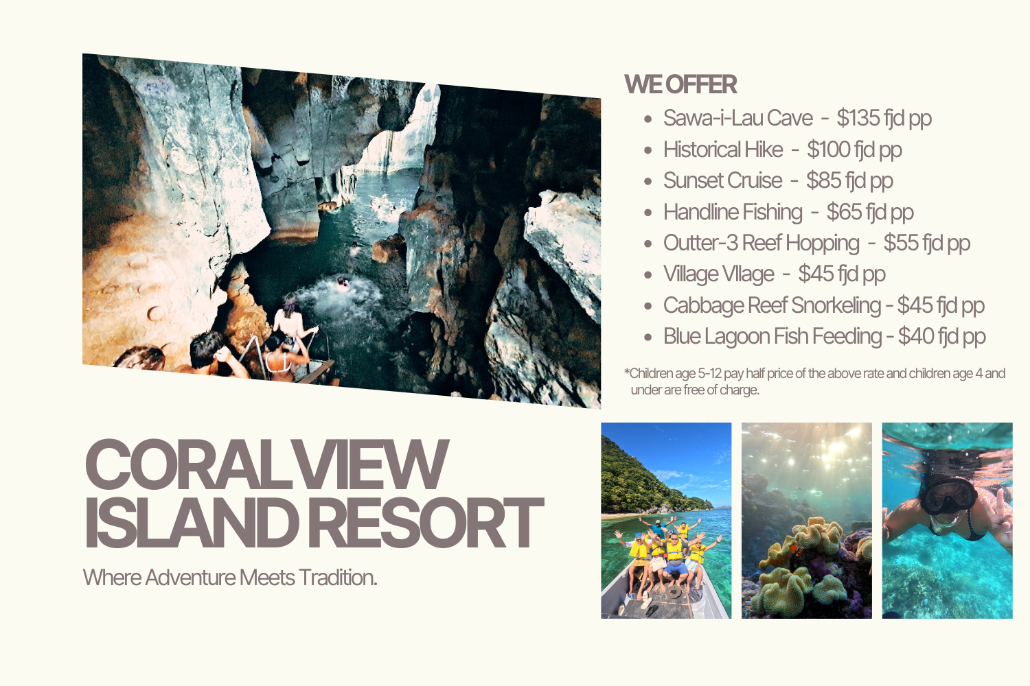 From exploring the mystical Sawa-i-Lau caves to snorkeling in crystal-clear waters teeming with vibrant marine life, every day at Coralview brings new adventures. Hike scenic trails with breathtaking island views, or dive deeper into Fijian culture through hands-on experiences like traditional basket weaving, coconut demonstrations, and kava ceremonies.